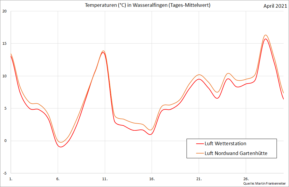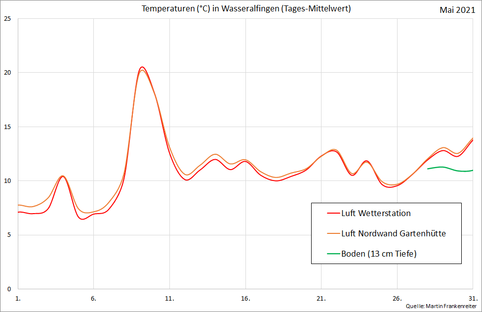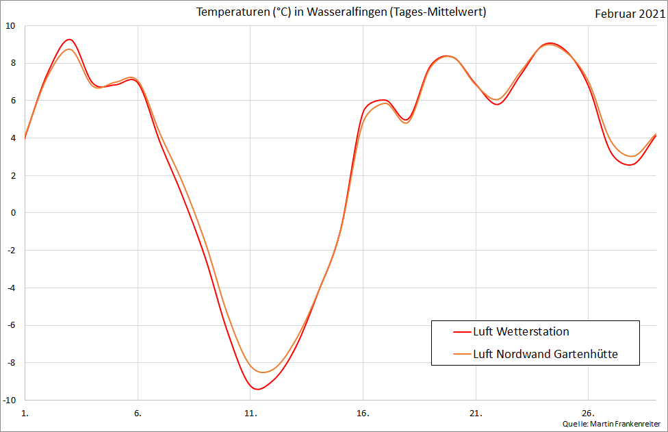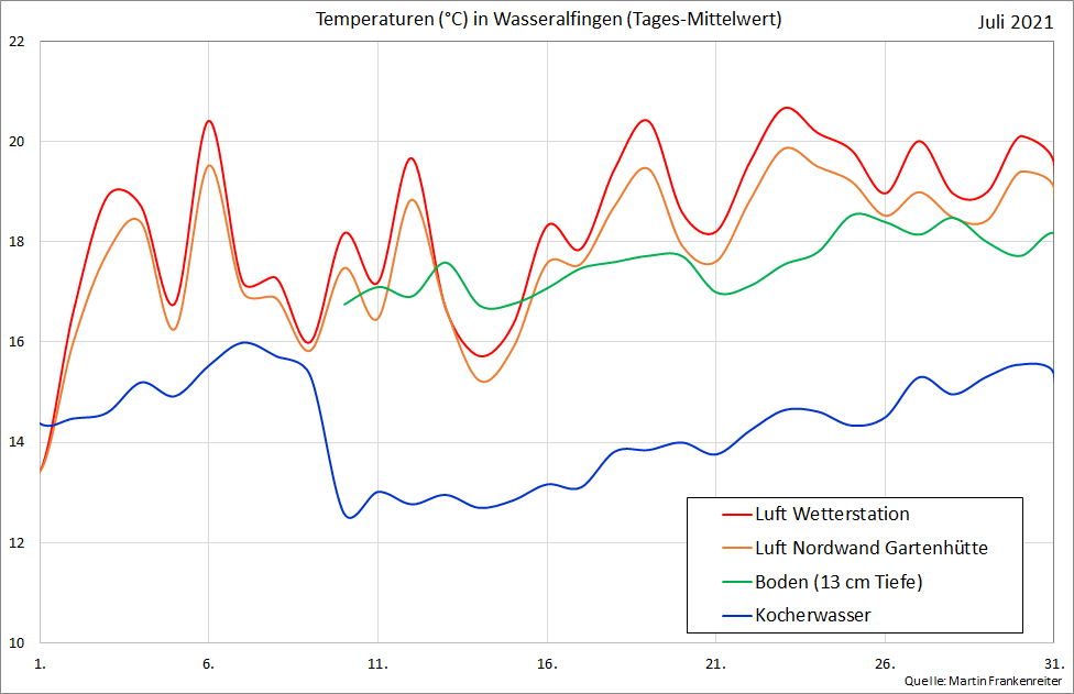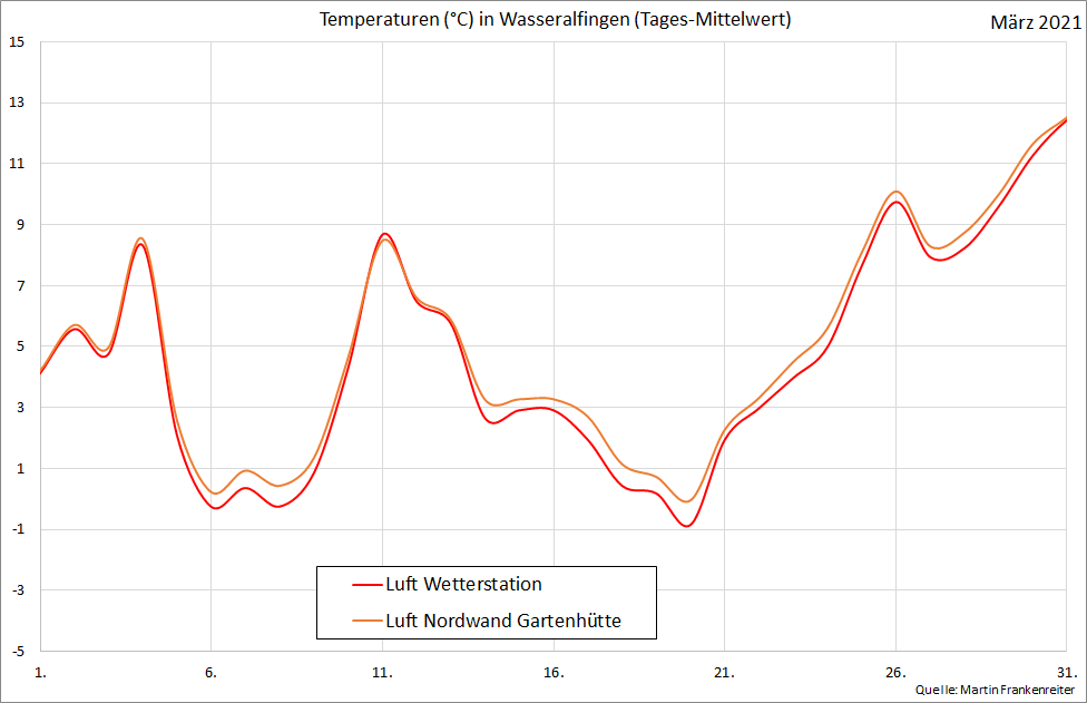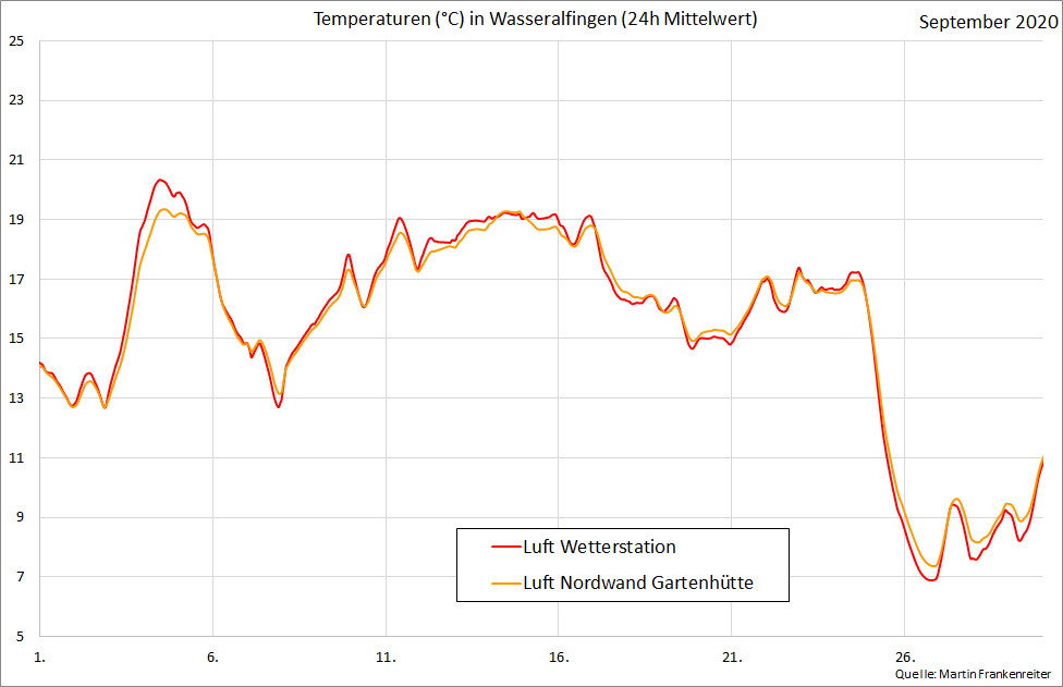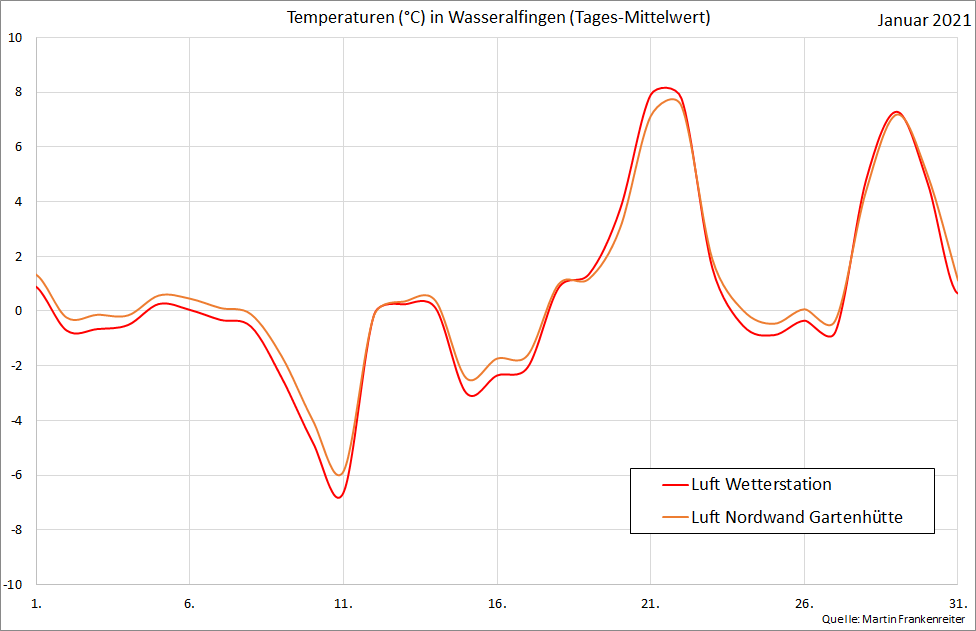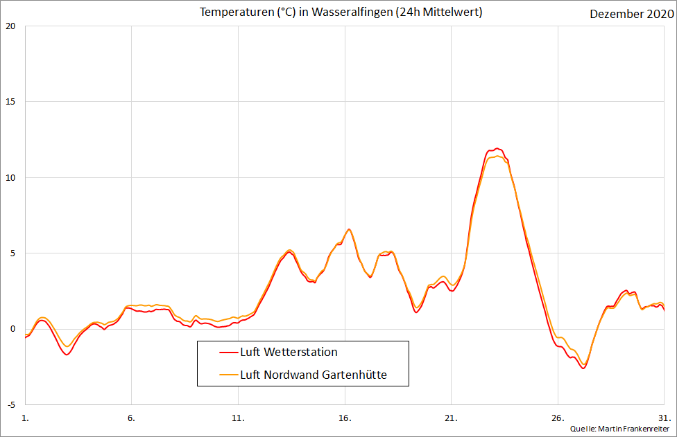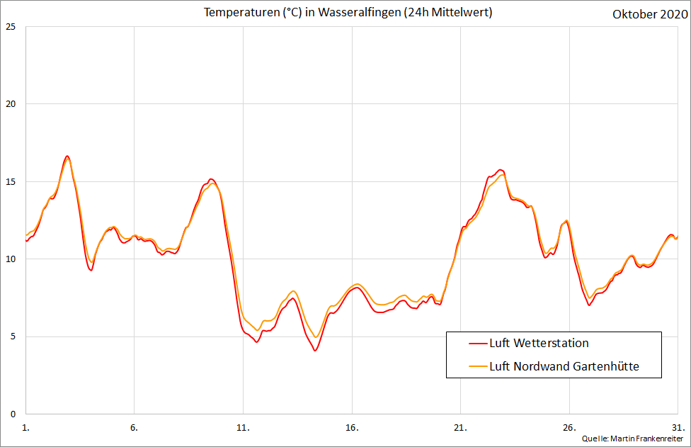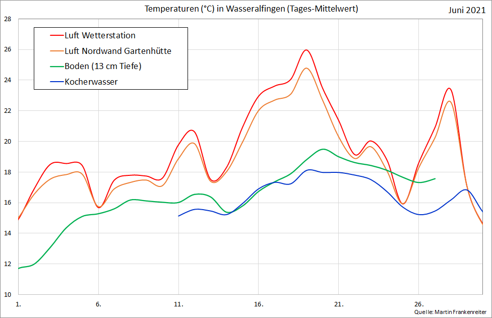 Aufgezeichnete Temperatur-Messwerte. Die Kurven beinhalten den gleitenden Mittelwert über 24 Stunden.